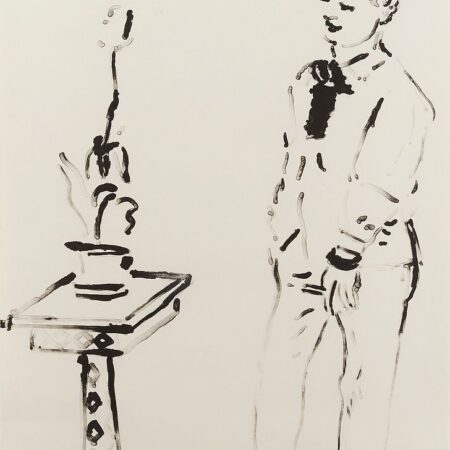 In addition to a wide-ranging and prolific artistic career, Hockney has also found success as a teacher and a theorist, and has published several well-received monographs. “Celia Musing” and “Celia Elegant” are from Hockneyís 1979 portfolio in collaboration with Gemini G.E.L. in Los Angeles. This portfolio consists of portraits of several of Hockneyís friends, a recurring theme throughout his body of work. It also shows his tremendous versatility as a portraitist, with works in a variety of styles and moods. These two works depict Celia Birtwell, a prominent British textile designer and longtime friend and model of Hockneyís. With spare, almost careless lines, he presents a vivid impression of Celia, chic and cheerful, drifting through an elegant home. The tonality of the lines builds the sense of fleetingness in her poses; it seems that she has briefly paused to contemplate the orchid in front of her before moving on through her day.
